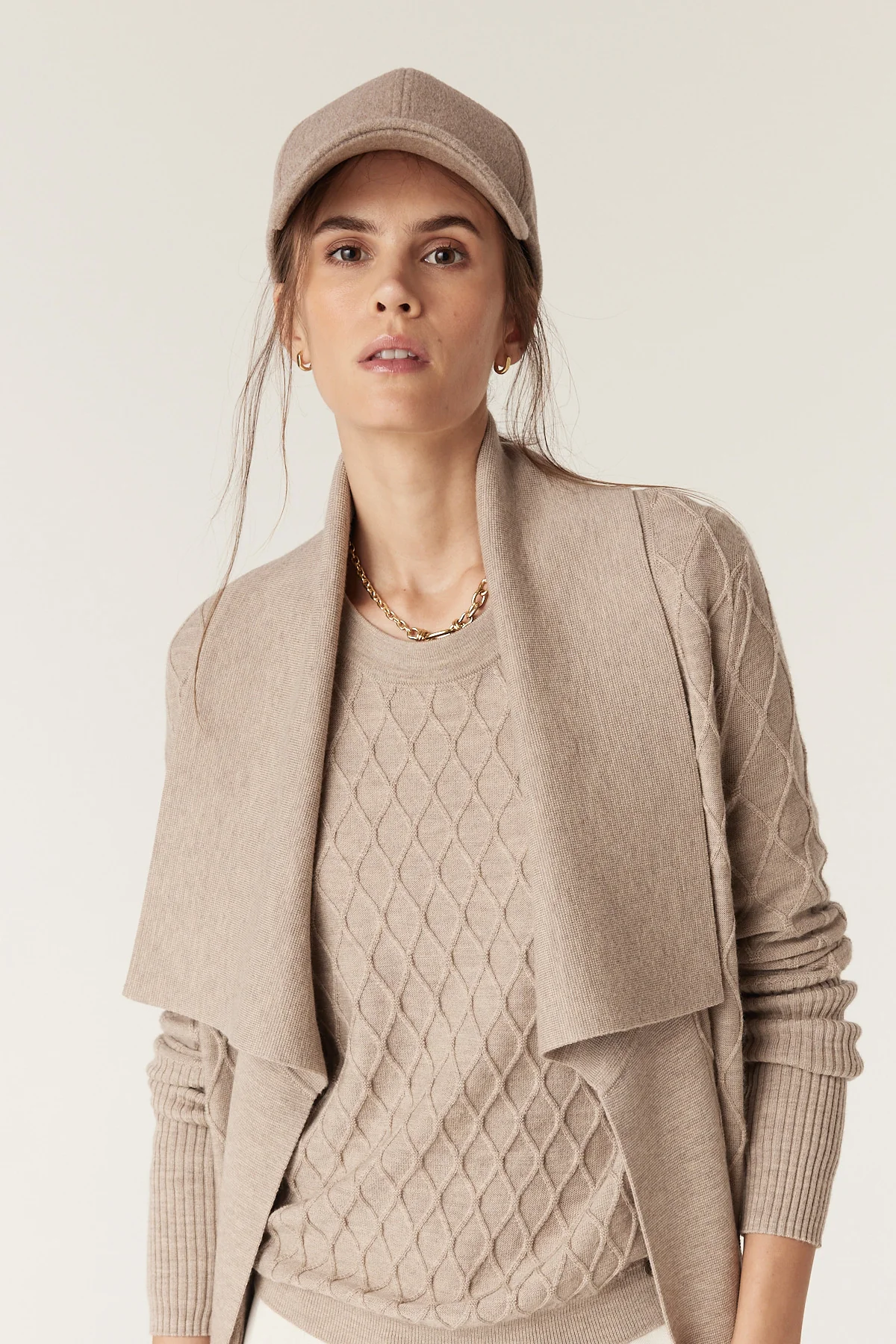 - Diamond cable stitch detail throughout
