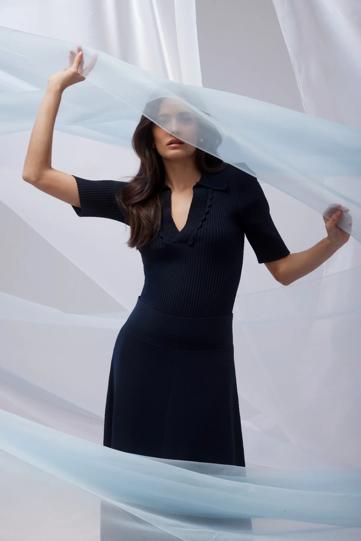 The Villa Crepe Polo Top is a slim fit, medium-weight rib knit style featuring a mesh pointelle polo collar and placket with scallop detailing. Finished with self-start cuffs and hem, it can be worn as a set with the matching Villa Crepe Knit Scallop Skirt.